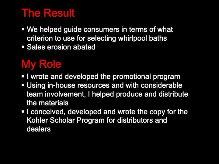While we sometimes partnered with outside promotion houses, much of the copywriting and design for plumbing collateral and marketing materials was created in-house by myself, members of our team, or our in-house agency. This allowed us to respond quickly while maintaining the brand’s high standards. Every brochure, mailer, and point-of-sale piece needed to enhance the quality and imagery associated with the Kohler plumbing brand. Later, I applied this same creative and promotional expertise to Maax bath products, continuing to deliver measurable results in the bath and kitchen market.